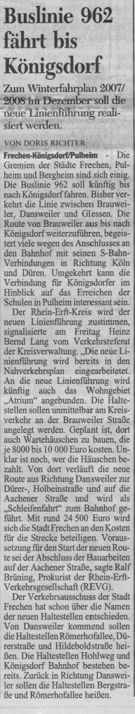 Die Buslinie 962 war auch Thema in der Sitzung des Ausschusses für Planung und Umwelt am 24.05.2007 (TOP 4). Die Vorlage können Sie hier einsehen.