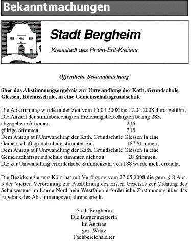 Glessen: Umwandlung der kath. Grundschule in eine Gemeinschaftsschule
