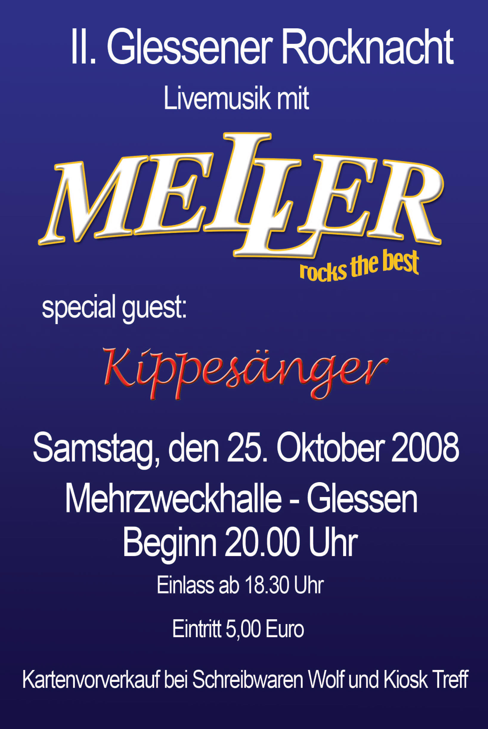 Mellerband und Kippesänger des MGV Glessen Bei der II. Glessener Rocknacht rockten 500 Zuschauer begeistert mit. Ungewöhnlich sowie einmalig war die Zusammenstellung der beiden musikalischen Acts, die in der Glessener Mehrzweckhalle auftraten. Als Vorgruppe begannen die Kippesänger – eine Formation des MGV Glessen - in ihrem neuen Outfit den Abend. Dabei schlugen die Kippesänger untypischeTöne an: Help von den Beatles. Unterstützt wurden die Kippesänger dabei bereits von Musikern der Meller-Band „Das war auch für uns neu und ein tolles Erlebnis. Wir werden uns künftig verstärkt auch um solche Songs bemühen“ versicherte Bernd Naumann, Vorsitzender des MGV Glessen.