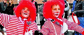 durch das Spalier der aufgerissenen Tüten. Die klassische Clownsperücke