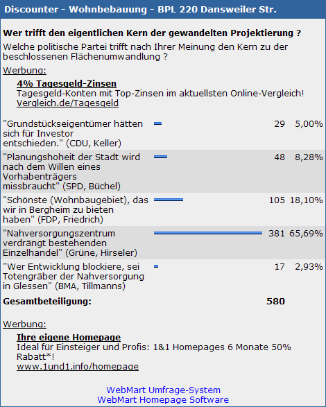 An der Umfrage haben 580 Stimmen teilgenommen. 65,69 % also fast 2/3 Mehrheit findet die Aussage von Peter Hirseler (Grüne) zutreffend.