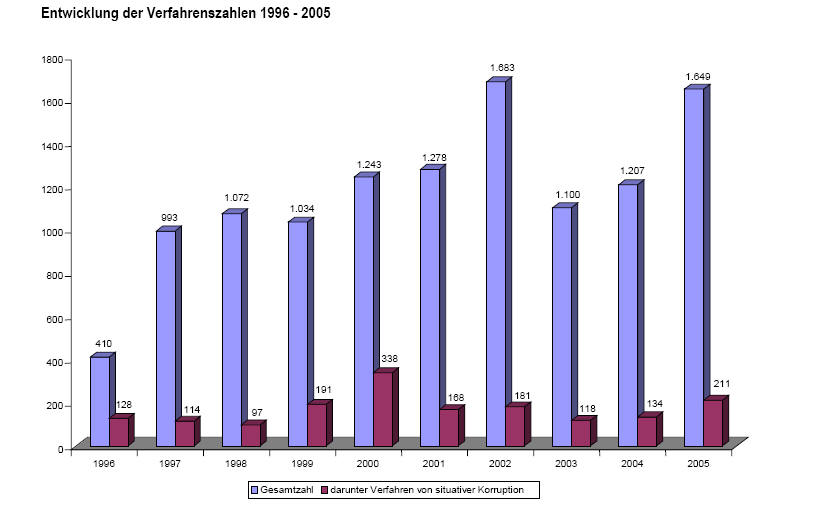 Die Entwicklung der Verfahrenszahlen 2005 haben sich bundesweit im Vergleich zu 2004 um 36,6% erhöht (ursächlich ein Korruptionskomplex in NRW mit 427 Einzelverfahren).
