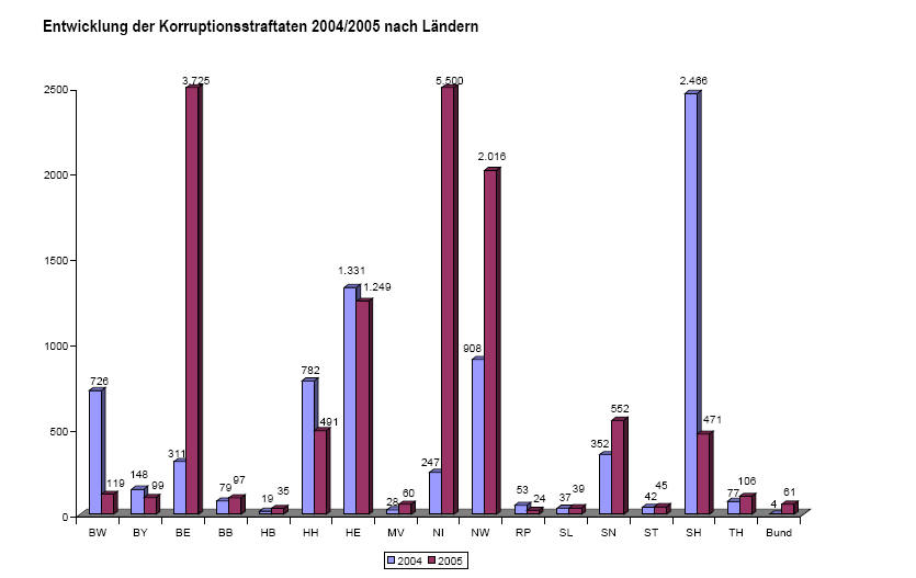 Quelle: Bundeskriminalamt "Bundeslagebild Korruption 2005" -------------------------------------------------------------------------------------------------------------------------------------------------------------------------------------------- Ein starker Anstieg der Korruptionsstraftaten auch in NRW. Hier bestimmten zwei Ermittlungskomplexe (Vergünstigungen bei Freizeitparkbesuchen, Vergabe von Handwerkerarbeiten) die Steigerung. Quelle: Bundeskriminalamt "Bundeslagebild Korruption 2005"