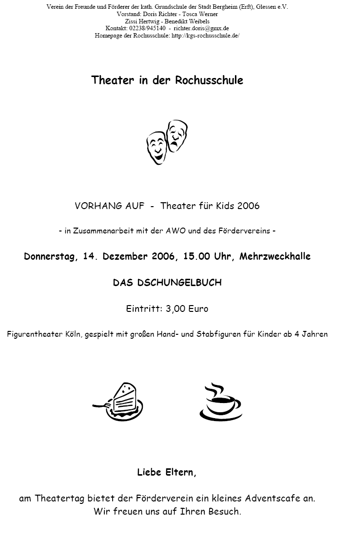 Vorhang auf Mit dem "Dschungelbuch" folgt am Donnerstag, 14. Dezember die sechste und letzte Vorstellung der Kindertheaterreihe "Vorhang auf" in diesem Jahr. Um 15 Uhr beginnt dieses außergewöhnliche Figurentheater für junge Besucher ab vier Jahren. Veranstaltungsort ist die Mehrzweckhalle. Am Wierichskamp in Glessen sein. Weitere Info unter 02271-89531. Quelle: Sonntagspost vom 25.11.2006 |
