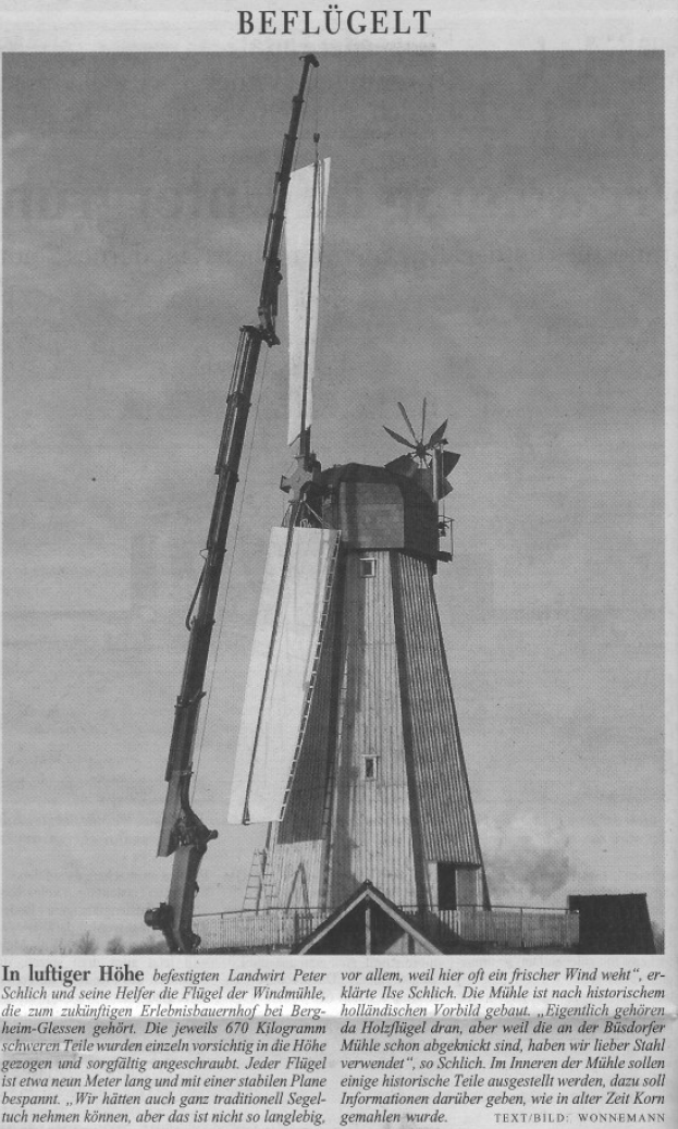 Sie sind neun Meter lang und wiegen 670 Kilo, die Flügel an der Mühle von Peter