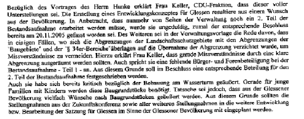 Quelle: KStA vom 03.08.2007 Kommentar: Öffentlichkeit tut Not ! Sowohl hier auf den Seiten der Glessen-Gazette als auch durch die Newsletter "Bürger-Info" erhalten die Bürgerinnen und Bürger Glessens weitergehende Information als durch die Bürgermeisterin Pfordt und ihre Stadtverwaltung als auch durch die Tagespresse verbreitet wird. Die Art und Weise der Informationsaufbereitung und die Informationsmöglichkeit als solche mag nicht jedermanns Geschmack treffen, aber das Stilmittel der Polemik ist jedenfalls im Rahmen der freien Meinungsäußerung nach Art. 5 Grundgesetz (Verfassung) legitimes Mittel. Zur Meinungsäußerung, vgl. hier. Unregelmäßigkeiten und Rechtswidrigkeiten kann man nur öffentlich aufzeigen. Unsere Stadträtin Keller und Bürgerwünsche ![]() Quelle: Auszug aus der Niederschrift der Sitzung des Ausschusses für Planung und Umwelt vom 11.05.2006 Nun sind rd. 140 Bürgerinnen und Bürger gegen eine Bebauung ! Weit gefehlt mit der Einschätzung der Bürgermeinung.