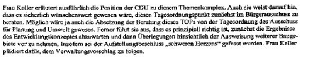 Quelle: Auszug aus der Niederschrift der Sitzung des Bürgerausschusses vom 12.09.2006 Ohne vorherige Beratung im Stadtteilforum (das unsere Stadträtin Keller immer als Bürgerbeteiligungsmöglichkeit "hochhält") oder gar Diskussion mit den Bürgerinnen und Bürgern wurde hier entschieden. Soviel zu dem Thema, was erzählt uns die Stadträtin Keller in Glessen und wie stimmt sie in Bergheim ab. "Schwere Herzen" tun nichts zur Sache. Reden und Tun sollten eines sein ! Ist es aber nicht. So leidet die Glaubwürdigkeit der Stadträtin Keller erneut. Wir können zusammenfassend festhalten: - keine Beteiligung der