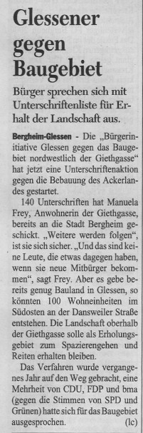 -------------------------------------------------------------------------- Herr U. Martin (FDP-Fraktionsvorsitzender) hat mich angemailt und folgende Klarstellung "Sie schreiben ...in Ihrer Gazette, dass das Verfahren zur Ausweisung des Baugebiets nordwestlich der Giethgasse" im vergangenen Jahr von einer Mehrheit von CDU,FDP und bma auf den Weg gebracht wurde. Das ist richtig." [Klarstellung: Artikel stammt vom Kölner Stadtanzeiger] Allerdings ist die FDP damals informiert worden, dass der Plan von der Kirche initiiert würde und damit Erbpachtgrundstücke als preiswertes Bauland für junge Familien zur Verfügung gestellt werden sollten. Diese Zielrichtung wollten wir unterstützen. Außerdem erhielten wir vorher Kenntnis über die Zustimmung der Lokalen Agenda Glessen. Seit dem wir Schriftstücke erhielten, in denen sich ein bekannter Glessener Bauunternehmer als eigentlicher Initiator des Planes uns gegenüber auswies, wurde uns damit klar, dass unsere Zustimmung auf einer Bewussten Falschinformation beruhte. Aufgrund dieser Tatsache hat die FDP den weiteren Verfahrensschritt zur Aufstellung dieses Bebauungsplanes im Rat nicht mehr unterstützt.