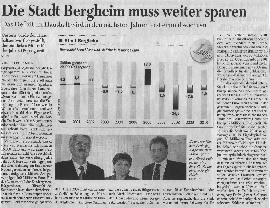 Am 27.03.2007 berichtete der KStA von dem steigenden Defizit der Stadt Bergheim. Wenn man dann großzügig auf Erlöse aus Immobilienveräußerungen verzichtet, ist dies nicht verwunderlich. Quelle: Werbepost vom 30.05.2007 Quelle: Broetje 04.06.2007 |