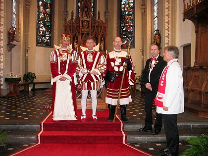 Glessener Dreigestirn Jungfrau Dietlinde II., Prinz Christian I., Bauer Ove vor der Messe - mit dabei: K.Lieberz und G. Lieven (Quelle: C. Paus 2007)