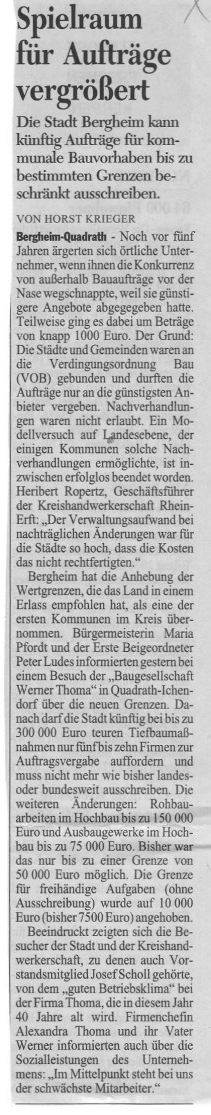 So, vor dem oben aufgezeigten Hintergrund erscheint doch die "Spielraumerweiterung" in einem ganz anderen Kontext. Im übrigen wird die Anhebung der Wertgrenzen auch von der VERPA (= Vereinigung der Leiterinnen und Leiter von Rechnungsprüfungsämtern in kreisangehörigen Gemeinden Nordrhein-Westfalens ) kritisch gesehen. Die VERPA ist ein seit 1975 bestehender freiwilliger Zusammenschluss. Ziel ist es, die Qualität der örtlichen Rechnungsprüfung durch Vernetzung und einen systematischen Erfahrungsaustausch sowie die gemeinschaftliche Weiterentwicklung von Prüfungsmethoden zu verbessern. Quelle: KStA vom 23.03.2007 |