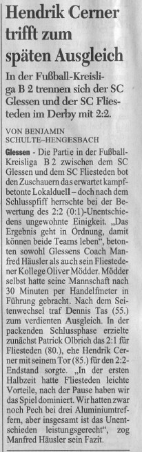 Glessen: SC Fliesteden Am 30.09.2007 um 15:00 Uhr findet das Spiel des SC Glessen gegen den SC Fliesteden im Glessener (Kreisliga B) Waldstadion statt. Rd. 12 Jahre ist es her, dass sich beide Mannschaften begegnet sind. "Am Samstag brennt das Waldstadion" meint Bodo Gesche, Vorsitzender des SC Glessen. Unterstützen Sie die Mannschaft des SC Glessen und schauen Sie sich das Spiel der Spiele an. Broetje 27.09.2007 |