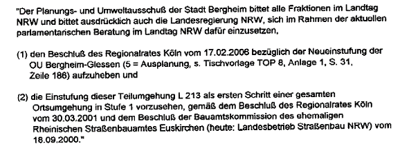 „Nach unseren intensiven Gesprächen mit CDU-Vertretern der Gremien des Rhein-Erft-Kreises, des Regionalrates, des Landtags bis hin zu Ministerpräsident Dr. Jürgen Rüttgers konnten jetzt einstimmige Beschlüsse gemeinsam mit den Vertretern der anderen Fraktionen gefasst werden, denn inzwischen stellten auch die SPD-Fraktionen fast gleichlautende Anfragen und Anträge. Sowohl der Kreistag als auch der Rat der Stadt Bergheim sollen eine Resolution an den Landtag mit dem Ziel richten, die Teilumgehung L 213 n als ersten Schritt für eine Gesamtumgehung Glessens in die Stufe 1 der IGVP erneut aufzunehmen.“ (Quelle: Stadträte-Mail von Keller – Paul vom 23.11.2006) Meine Kommentierung hierzu,