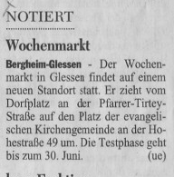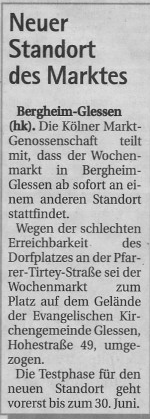 Glessener Wochenmarkt jetzt auf dem Gelände der ev. Kirche Auf Anfrage teilte die Kölner Markt-Genossenschaft e.G. (KMG) mit, dass der Glessener Wochenmarkt auf dem Vorplatz der ev. Kirche (Hohe Str. 49) stattfindet und zwar probeweise bis zum 30.06.2007. Also für uns Glessener besteht durch die Standortveränderung auch weiterhin die Möglichkeit auf dem Wochenmarkt einzukaufen. Immerhin eine sinnvolle Ergänzung im Nahversorgungsbereich. Durch die Umfrage (die hier in der Zeit vom 13.09. - 13.10.2006 durchgeführt wurde) stellte sich heraus, dass der Wochenmarkt grundsätzlich angenommen wird. Allerdings stellte sich nach Rücksprache mit der KMG heraus, dass der Dorfplatz als Standort kritisch gesehen wird. Aus diesem Grund habe ich dann am 04.12.2006 einen Antrag gestellt, der zwischenzeitlich am 15.01.2007 in der Bürgerausschuss-Sitzung behandelt wurde. Dort wird dann allerdings ohne nähere Angaben darauf abgestellt, dass sich auch die Stadträtin Keller um eine Standortsuche bemüht. Allerdings war hiervon in meinen anfänglichen Kontakten mit der KMG keine Rede. Nun denn, sei es wie sei. Das ist genau müßig wie die Frage, was vorher da war: das Huhn oder das Ei. Hauptsache ist doch, dass eine weitere Nahversorgungsmöglichkeit mit einer besseren Erreichbarkeit für uns Glessener da ist. vgl. auch "Broetje beantragt Standortsuche für Glessener Wochenmarkt" Quelle: Broetje 06.03.2007